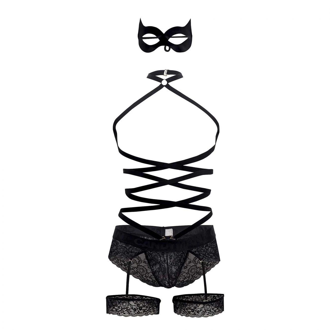 Body Candyman 99483. Un body style porte jarretelle en dentelle. Ultra sexy avec ses bretelles qui enveloppent tout votre corps. Masque pour vous donner un look mystérieux. 83% Polyamide, 17% Elasthanne.