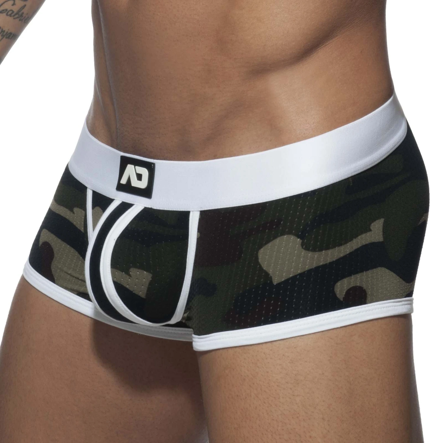 Boxer Addicted Camo Stripe AD765. Boxer très confortable en tissu mesh. Large ceinture élastique avec le nom de la marque sur le devant. Imprimé Camouflage et coutures contrastées. 80% Polyamide, 20% Elasthanne.