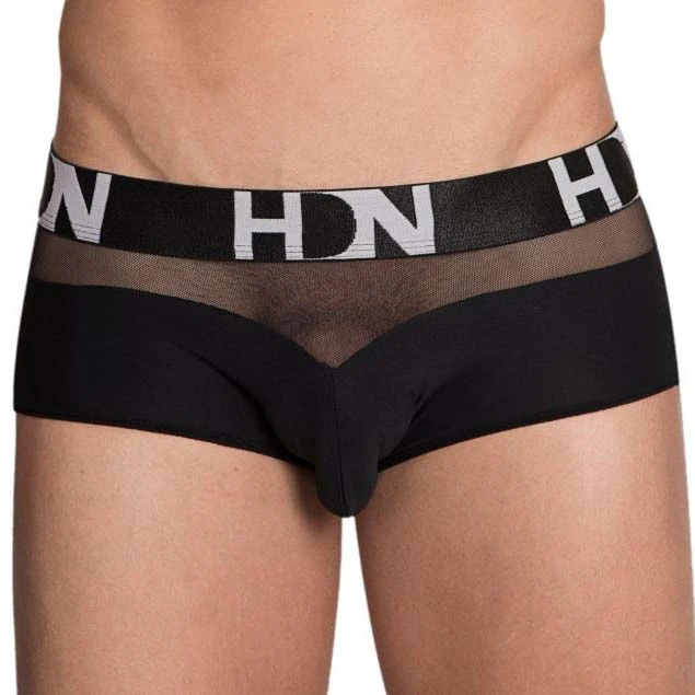 Boxer Hidden 952. Boxer très sexy qui joue la carte de la sensualité avec son tissu mesh à mi-hauteur à l’avant et à l’arrière le laissant transparent. Tissu effet seconde peau pour un confort maximal. Large ceinture argentée logotée HDN. 93% Nylon, 7% Elasthanne.