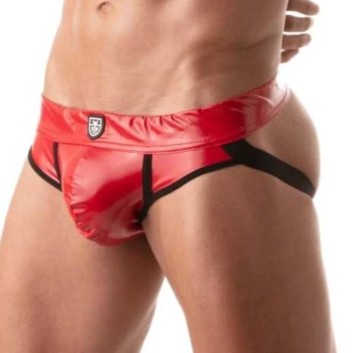 Jock Strap Vinyl TOF PARIS TOF183R. Jock Strap très sexy dans une coupe taille basse. Tissu imitant le cuir ciré. Poche frontale généreuse. Ceinture élastique avec le logo au nom de la marque. Conseils d’entretien : laver à la main, ne pas sécher en machine, ne pas repasser. 55% Polyester, 35% Polyurethane, 10% Elasthanne.
