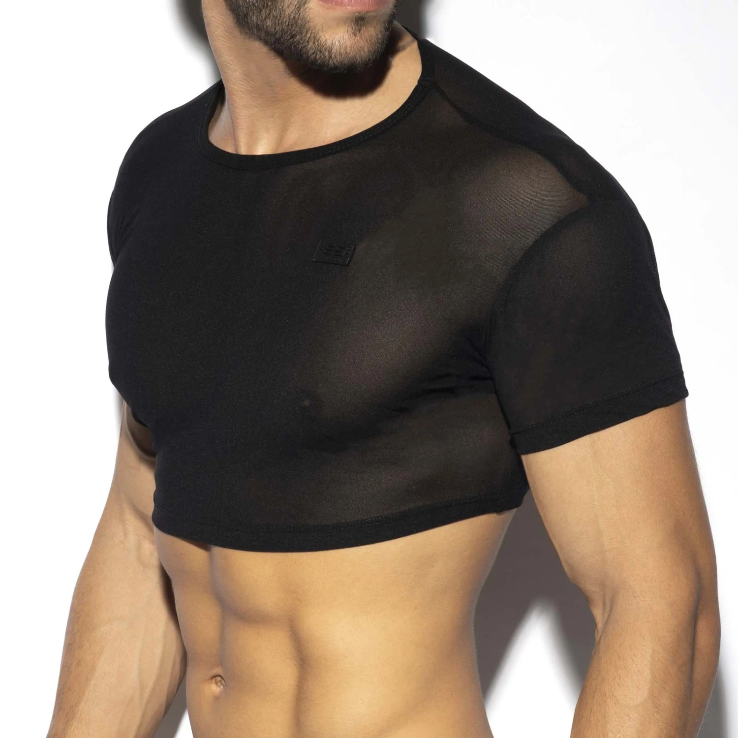T-Shirt Crop Top ES Collection Net TS293. T-Shirt col rond. Très près du corps. Matière extensible et transparente. Étiquette en silicone ES Collection sur la poitrine gauche. 93% Polyester, 7 % Elasthanne.